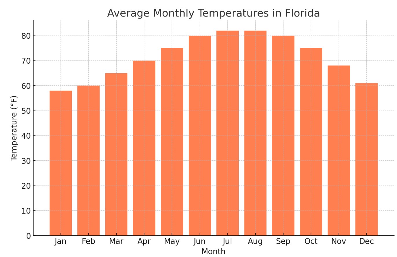 Clima: Agosto continúa con la tendencia cálida y húmeda en Florida, con temperaturas que oscilan entre los 24 °C y los 33 °C (76 °F y 92 °F). El clima se mantiene muy cálido, con frecuentes tormentas eléctricas y alta humedad. Agosto también se encuentra en el pico de la temporada de huracanes, por lo que es posible que se produzcan tormentas tropicales.