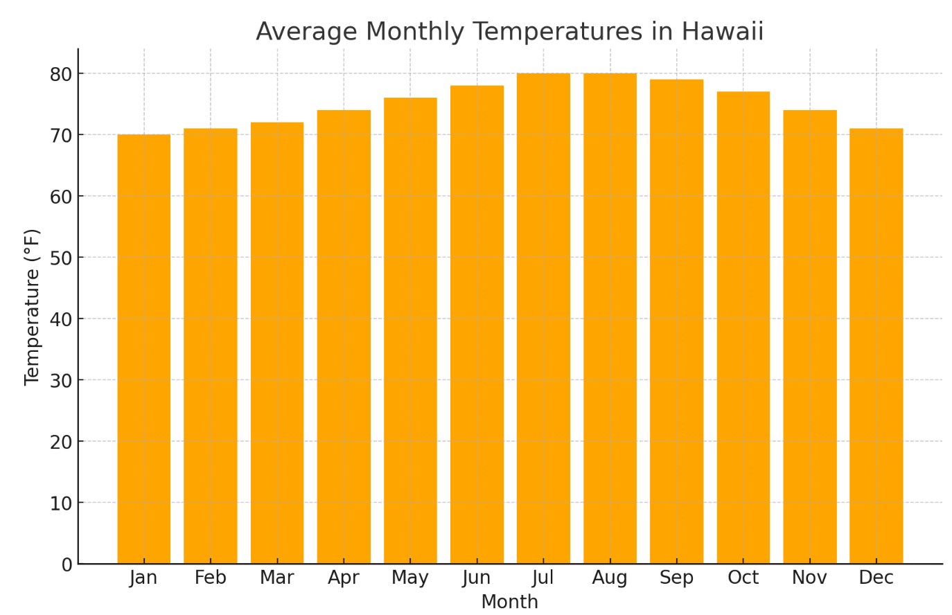 מזג אוויר: אוגוסט ממשיך את המגמה של מזג אוויר חם ויבש בהוואי, עם טמפרטורות הנעות בין 76°F ל-88°F (24°C עד 31°C). זהו אחד החודשים החמים ביותר של השנה, עם כמות גשמים מינימלית, במיוחד בצדדים הקדמיים של האיים. רוחות הסחר עוזרות לשמור על החום נסבל, מה שהופך אותו לתקופה פופולרית עבור חובבי חופים וחובבי חוצות.