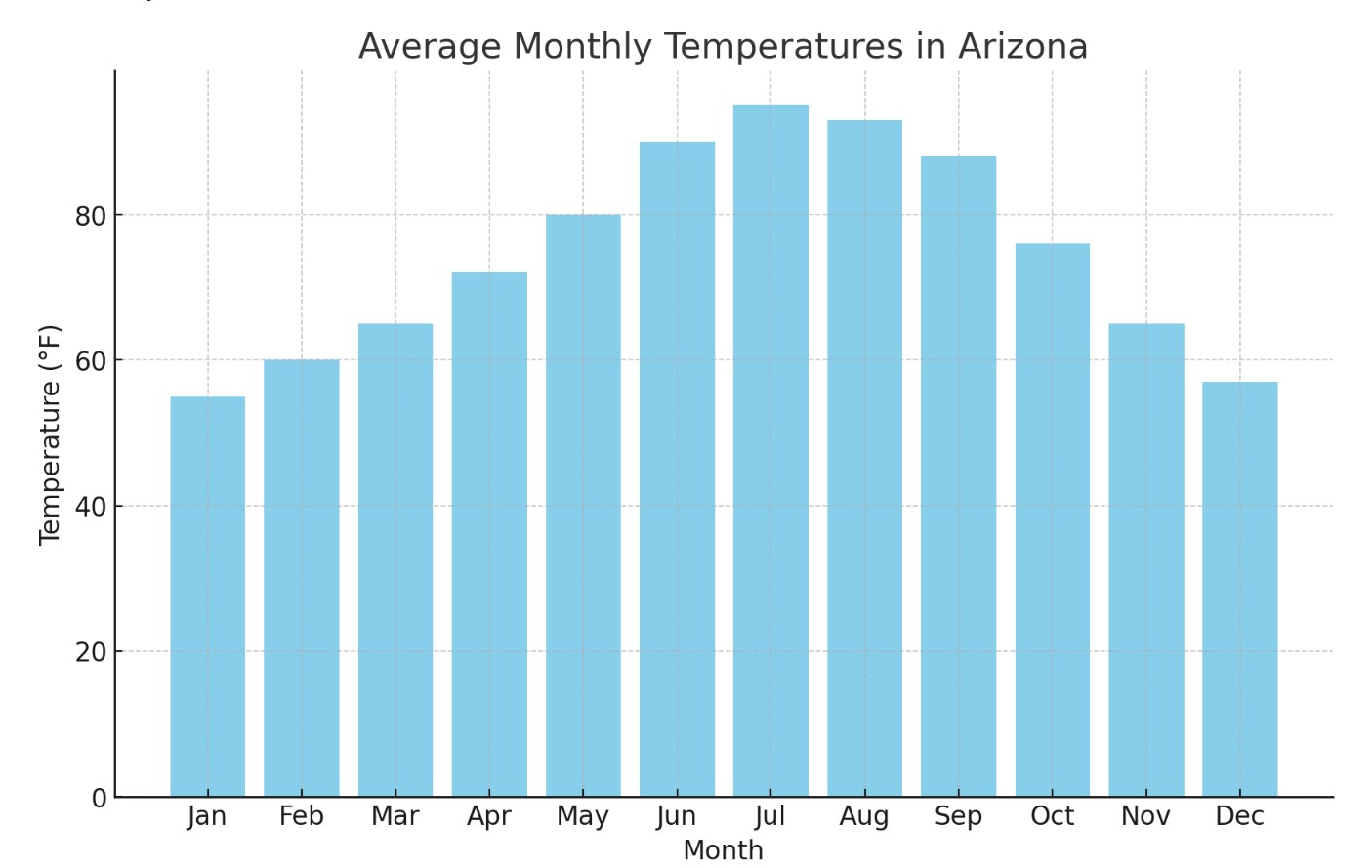 Meteo: agosto continua la tendenza al caldo nell’Arizona meridionale, con temperature che rimangono sopra i 100 °F (38 °C). La stagione dei monsoni è in pieno svolgimento, portando frequenti temporali e brevi periodi di raffreddamento. L’Arizona settentrionale vede temperature leggermente più fresche, con medie tra 60 °F e 85 °F (16 °C e 29 °C).