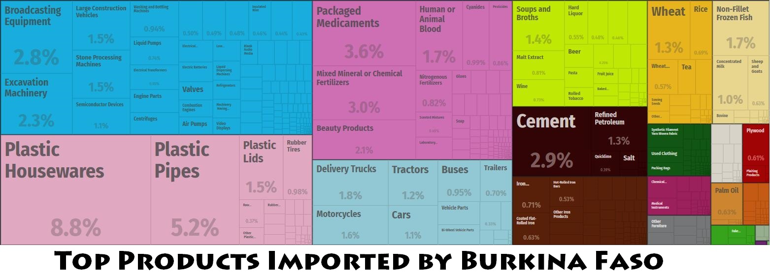 Burkina Faso, a landlocked country in West Africa, has a growing economy primarily driven by agriculture, mining, and services. However, the country heavily relies on imports to meet the needs of its population and industries, as domestic production is limited in certain key sectors. The major imports of Burkina Faso include machinery, petroleum products, vehicles, foodstuffs, and consumer goods, with trade conducted largely through neighboring countries like Ivory Coast and Ghana. The import profile is shaped by the country’s infrastructure needs, agricultural demands, and the growing urban population.