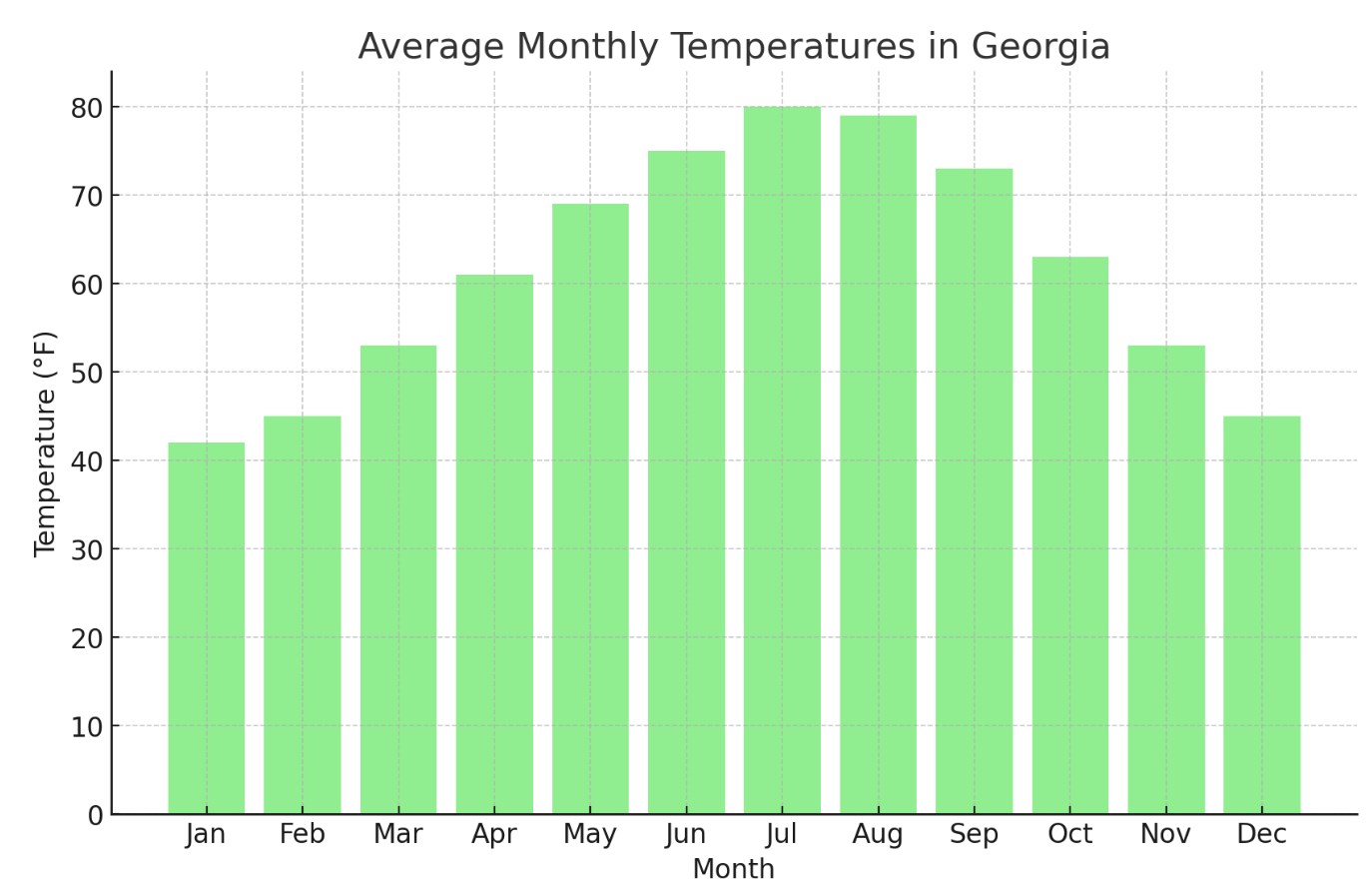Погода: серпень продовжує спекотний і вологий тренд у Грузії з температурами від 70°F до 91°F (21°C до 33°C). Спека та вологість залишаються високими, з частими грозами вдень. Серпень також припадає на пік сезону ураганів, тому можливі тропічні шторми, особливо в прибережних регіонах.